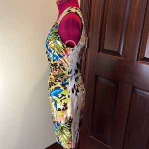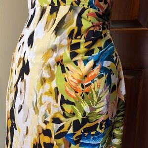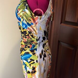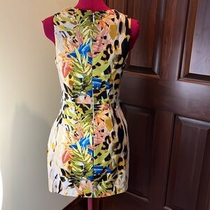 Bebe NWOT. Beautiful wrap top Dress with snap closure in front Multicolor mini Mix of Black,brown, royal blue, Orange, Olive green yellow, tan and beige on white background Sleeveless