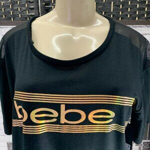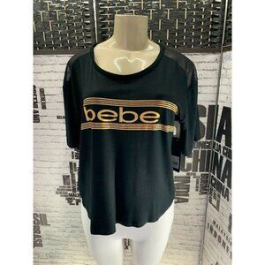 Bebe XL Black Logo Gold Mesh Trim Short Sleeve Crop Tee