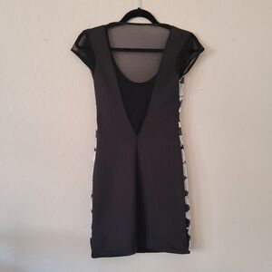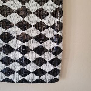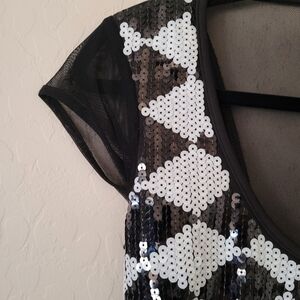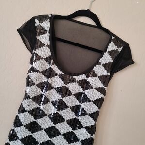 Excellent pre owned condition. Y2K - 2B Bebe Black & White Sequin Dress. Scoop neck.. Short cap sleeves. Deep V sheer back. Side zipper. Stretch.