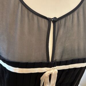 Beautiful Vintage Y2K feminine blouse by Bebe. Coquette Short Sleeve Silk Blouse. Black with Cream Ribbon Detailing across chest and around sleeves. Front keyhole and pleats. In great preowned condition.