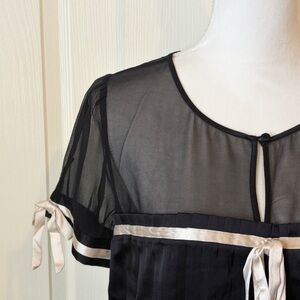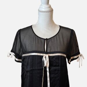 Bebe Y2K Coquette Short Sleeve Silk Blouse Black with Cream Ribbon Detailing
