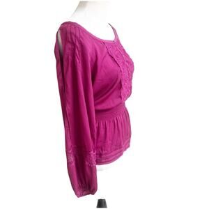 Bebe Y2K Peplum Top Satin Long Sleeve Size XS Fuschia Pink Slit Shoulder Lace