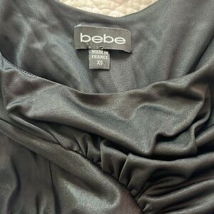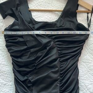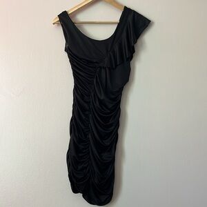 Sexy and fun Y2K era Bebe sleeveless bodycon dress. Diagonal ruching and ruffles for a flattering fit. Very stretchy.