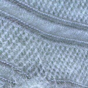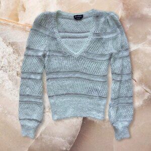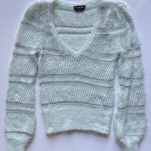 Description: very light seafoamgreen, almost white fuzzy knit long sleeve sweater with silver tone thread detail and V-neck by bebe in US women’s size M. Sweater runs small; please refer to measurements below.