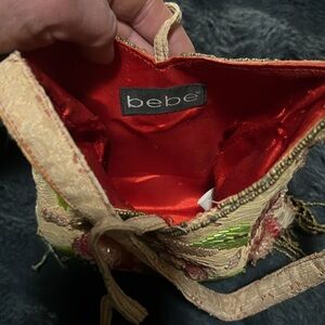 Adorable bebe beaded floral bag. Pink, green, fuschia and matte gold beading on a rose pink background. Red satin lining. Great little bag for a night out and also cute with a sundress for day.