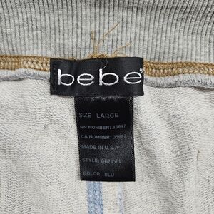 The Bebe Y2k Drawstring Lounge Pants in size Large feature a trendy wide-leg flare design with denim accents and drawstring waist.