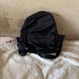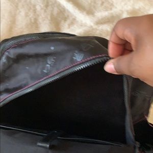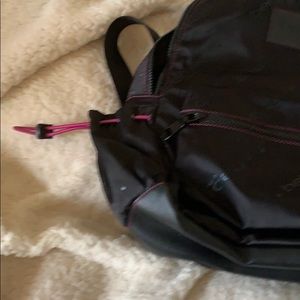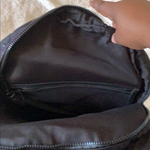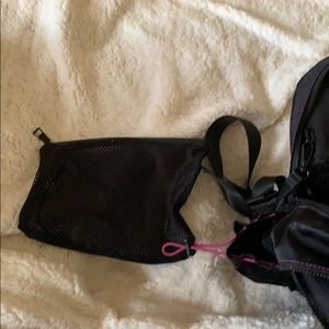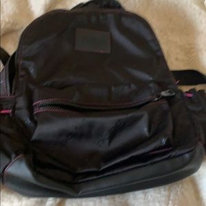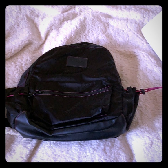 Bag medium sized backpack with purple detail. Two side pockets. Two large pockets. The last pocket a zipper pocket inside. Mesh Detachable makeup bag clipped inside as well. Nice solid black lining