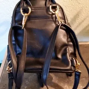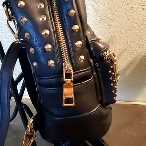 Bebe backpack in black faux leather with brass and silver rivet accents. Fully adjustable straps, two small side pockets complete the exterior. Interior is very clean. Measures approximately 8"h x 9"w and 4-1/2" across bottom. Stored in a non-smoking home and I consider all offers.