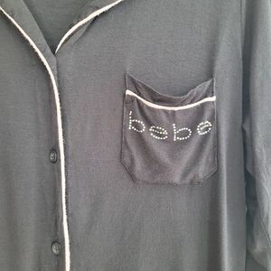 Bebe black & pink bedazzled button up pajama top with a front pocket and collar, material is really soft and stretchy. In excellent pre owned condition with no signs of wear or damage.