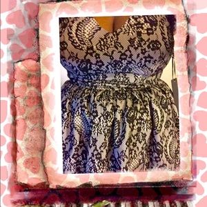 Elegant and beautiful bonded lace dress featuring a scallop-tiered design and deep double V neck. Undernetting ensures a playful, poof-skirt silhouette. Hidden back hook-and-eye and zip closure. Fully lined. Empire waist is fitted (no stretch). Brand new from factory.