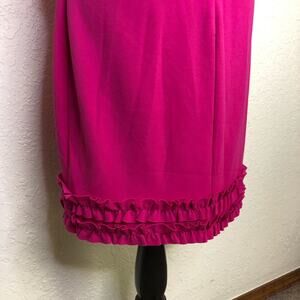 Bebe bright pink halter neck sleeveless ruffle hem dress.  Halter neckline  that buttons at back.  Sleeveless.  Ruffle trim hemline.  Open square back.  Zips in back.  Fully lined.  Size Large.  New with tags NWT.