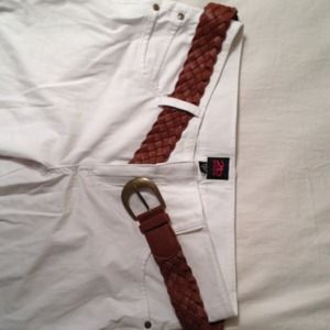 White bebe cropped pants with cognac braided belt