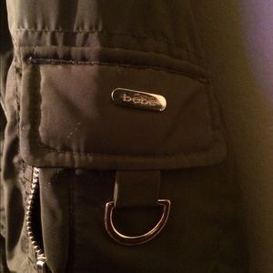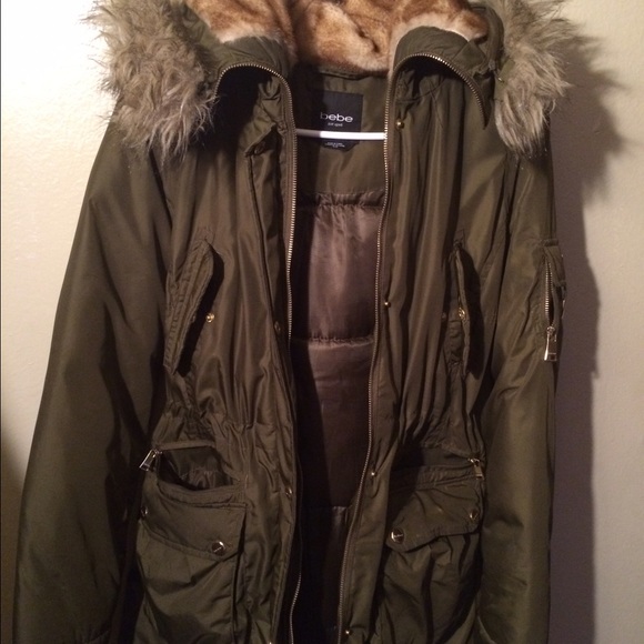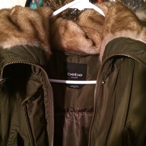 Green down coat by BeBe zipper broke otherwise coat is perfect needs a trip to the cleaners and it'll be like new