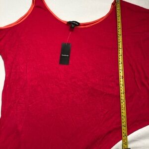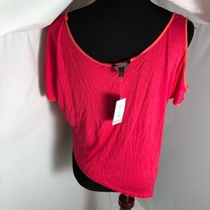 Bebe drapey deep rose asymmetrical hem top with orange edging and one side cold shoulder. Super soft and flattering. Smoke free home