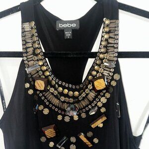Perfect for a night out, party, or special event! This sleek sleeveless dress features eye-catching gold, silver, and metallic embellishments around the neckline for a built-in statement necklace look. Soft fabric with a flattering drape.