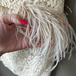 Bebe dress in off white. Built in support for the top. Zip up the back and two delicate buttons for the back of the neck. This is stunning and perfectly fitted for size 8. Ostrich feathers are a fun accent and they go all the way around the waist.