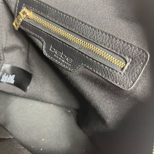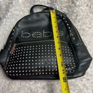 Bebe faux leather black mini backpack with rhinestones and gold studs accents .front zipper pocket top zipper the inside lining has a side zipper and two side zipper pockets.pre owned in good used condition one stone is missing from the front no peeling see all pictures any questions please message.