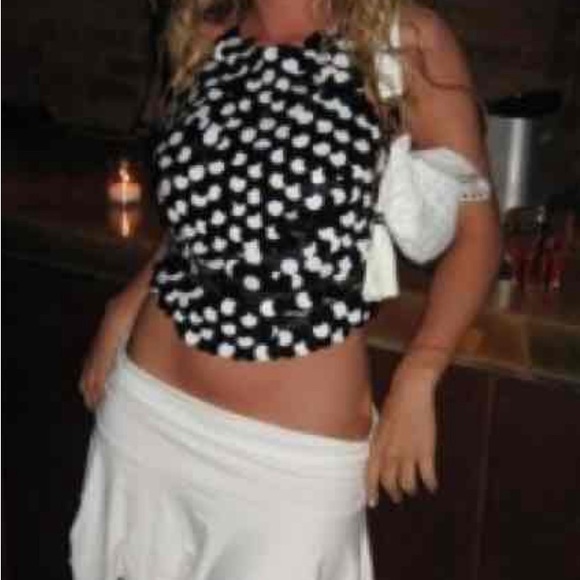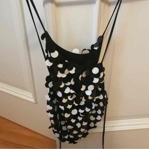Bebe black and white top with open back. Ties in back. The material is made up of small plastic like circles. Such a cool top!!!