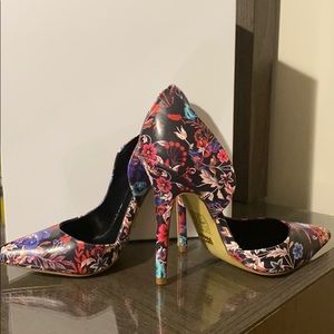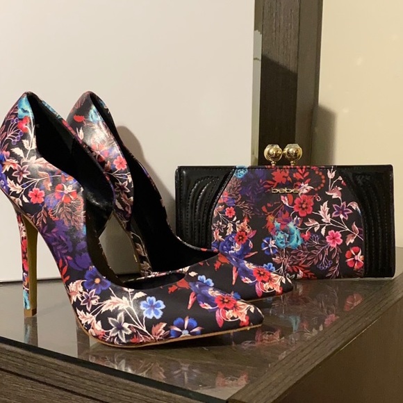 Bebe size 7 heels. Never worn no scuffs on the shoe. whatsoever. Never worn outside either. Only tried on inside the home. Matching wallet clutch also available. Ships from a Smoke and pet free home.