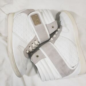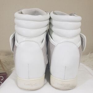 Bebe high top white sneakers size 9 in a decent preowned condition . Great for this season very chick and fashion.