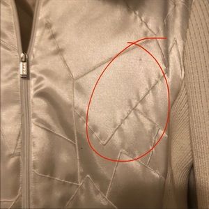 Bebe jacket w/ white fur and sweater sleeves front is a satin material. Cream and white color size large but believe it runs small and fits more like a medium. Great condition some minor pulls that are hardly noticeable. See pics. I Purchased some years back and I don’t think it was ever worn. Just hung in my closet. Absolutely beautiful jacket! Stunning in person! If you have any questions please ask thank you.