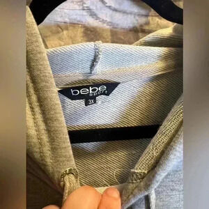 Bebe logo hoodie in heather grey with front pocket and colorful logo print.