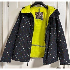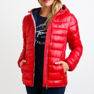 Bebe long sleeve notch lapel buttonless jacket in a beautiful coral red. Cosmopolitan lightweight crepe jacket featuring impeccable details including a sleek notched lapel, 2-piece sleeves and front flap welt pockets, hook closure. Size 6. P2P laying flat 20".