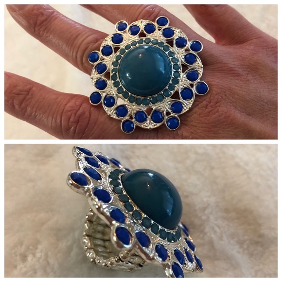 Turquoise blue center stone with dark blue stones, over silver setting.