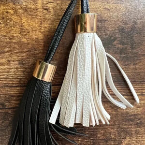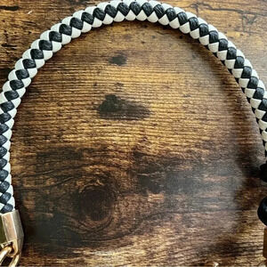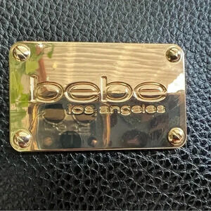 Bebe satchel handbag/purse. Black pebble grain, with black & white braided handles. One black & one white tassel, all with gold hardware. Gold Bebe metal plate. Inside slip in pockets and inside side zip pocket. 4 gold metal feet at bottom of bag. Like new. Used once. Size: 11”x13”. Handle: 7.5”x6