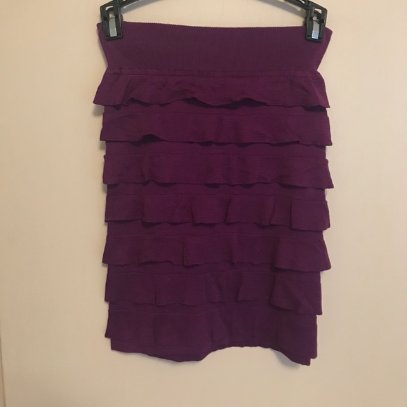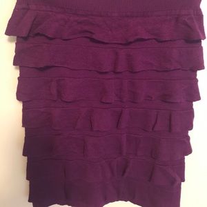 Ruffled purple skirt. Good amount of stretch would easily fit a small . Very soft material, form fitting skirt. Rich purple color.