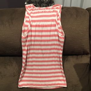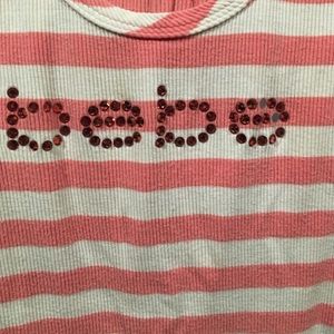Striped Bebe tank top. Tag was removed but I believe it is a size S/M. White and salmon striped. Okay condition. *2 rhinestones are missing in the last 'e'*