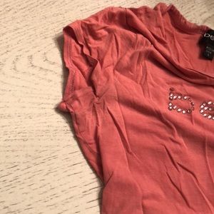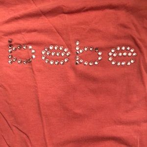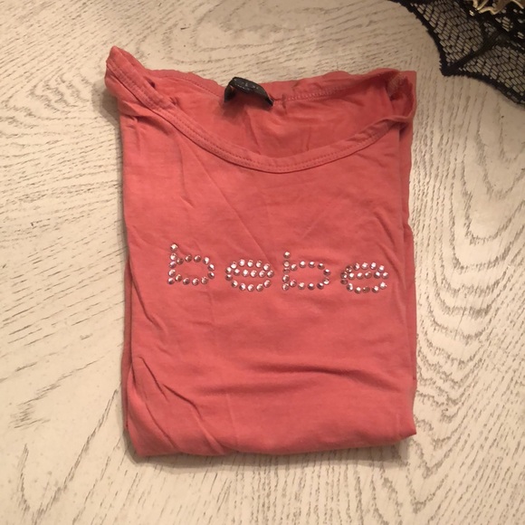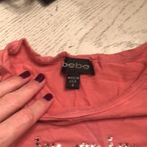 The go too for all the 90s cool kids! Beautiful Bebe top on pink dark coral with rhinestones. Good shape for a favorite shirt. Minor pilling I’ll see arms.