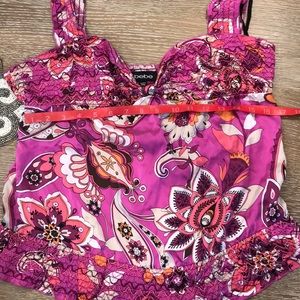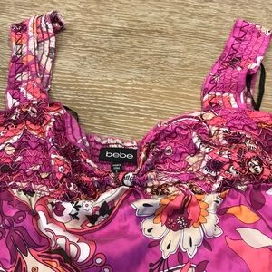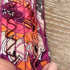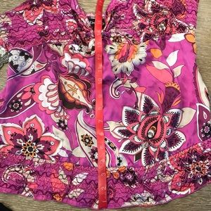100% silk tank has runched top sweetheart style. Flows subtly after bust. Beautiful purples corals and pinks. Note some flaws on the straps. Barely noticeable and doesn’t impact shirt and all threads still intact. Open to offers!