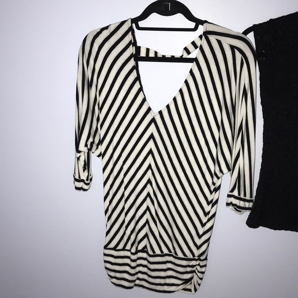 Three quarter sleeve, deep v in the back. tunic length striped Bebe Top. Worn 3 times