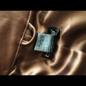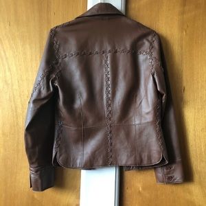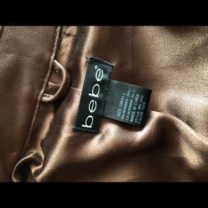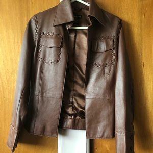 bebe brown genuine-leather jacket. Looks like it’s never been worn! The leather is very smooth. It has an open closure so it does not button or anything like that.