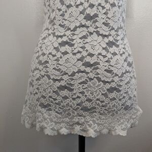 Description: Bebe 90s Y2K Lace Fairycore Whimsigoth Rock Glam Grunge Witchy Feminine LG Top, puff sleeve detail, wavy lettuce hemline, body skimming silhouette, made in the USA