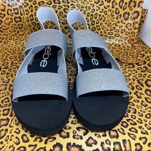 Bebe Atena Silver Giltter Stretch Sandals NWT Sz9