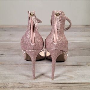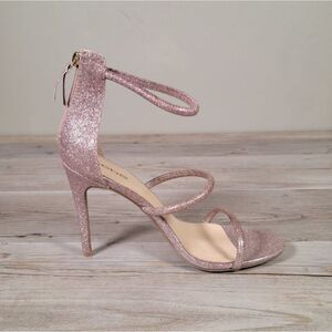 This strappy high heeled sandals from Bebe are completely man-made with glitter all over. Zip up back closure. Approximately 4" stiletto heel.