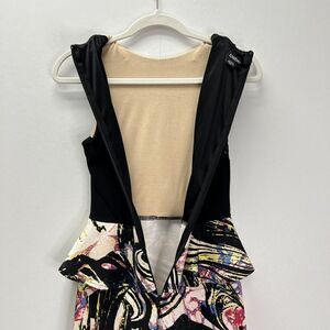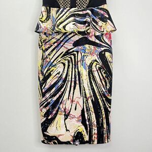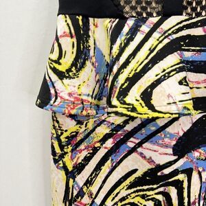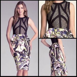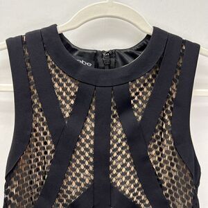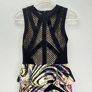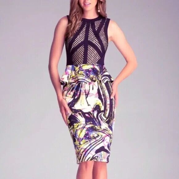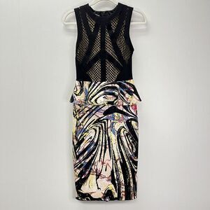 Bebe Bodycon Peplum Lace Neoprene Scuba Bright Colorful Midi Dress Sleeveless Black XS