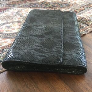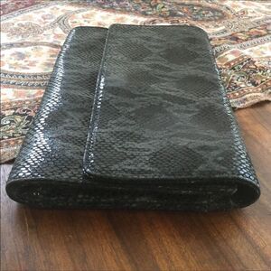 Bebe Black Snakeskin Python Print Envelope clutch purse, feels like leather but there is no tag, optional silver link chain strap, magnetic snap closure, in great shape really pretty. Approx. 9.5” wide, 6” High, 1” deep, 9” strap drop. Happy to answer questions, thanks!