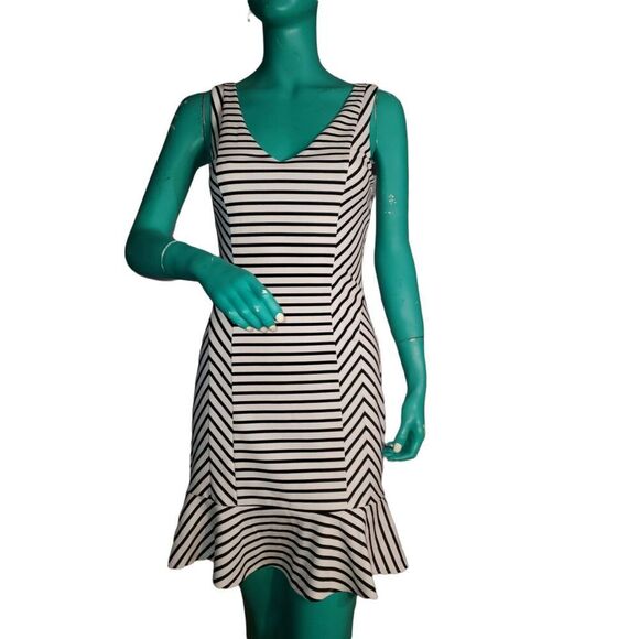 Can't find the fabric tag, but feels like a cotton polyester blend, shift and stretchy. Would look great with a little blazer for work.