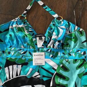 Bebe Jungle Print Neck Tie Halter Top size L NWT 95% silk 5% Spandex