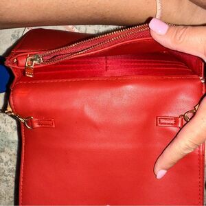This elegant crossbody bag from Bebe features a striking red color and a sophisticated quilted design. The metal chain strap adds a touch of chic style, making it a perfect accessory for any occasion. Its compact size is ideal for carrying your essentials with ease.