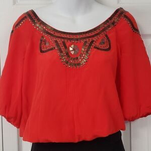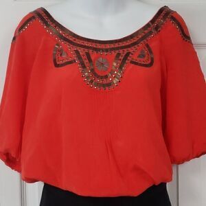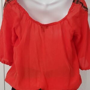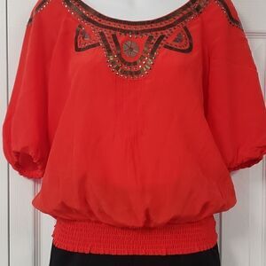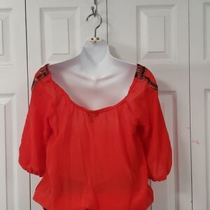 Beautiful Bright Orange, Sheer, Beading Details, Light and loose Fit, Lightly Falls Off Shoulders, Elbow Sleeves With Elastic Cuff, Stretch-smock hem, New.