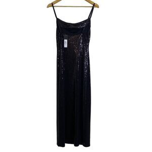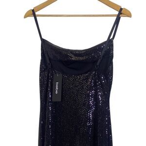 NWT Bebe black sequins form fitting dress with adjustable spaghetti straps and a waterfall neckline . Very stretchy! Gorgeous dress with a side slit.