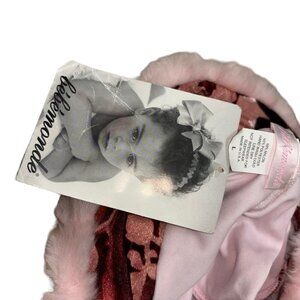 Bebemonde Girl's Bucket Hat in Size Large. Velvet Upper with a floral Print, with a pink faux fur trim. New with Tag. The fabric is a Nylon Polyester Blend. Great Condition.
