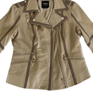 A Bebe leather jacket . This is a rare one and it has a lot of details . It's in excellent condition and comes from a smoke free and pet free home. It's a beige color and it looks great with jeans or dresses up.