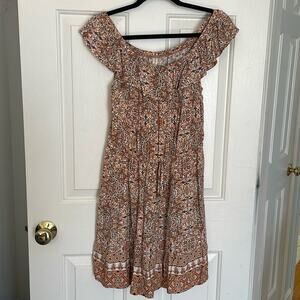 Bebop Dress Large Off Shoulder Ruffled Neckline Floral Orange Blue White Yellow