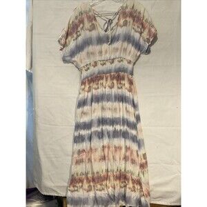 This beautiful BeBop maxi dress is sure to turn heads wherever you go. The dress features a vibrant tie-dye pattern in a colorful palette that is perfect for any occasion. The V-neckline and short sleeves add a touch of elegance to the dress, while the tie closure in the back allows for adjustability and a comfortable fit.