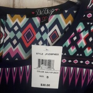 Brand new with tags, Bebop brand shift Dress, size small. 100% Polyester. Navy blue with multicolored chevron style geo print. All items are from a pet free, smoke free home and will ship same or next day.